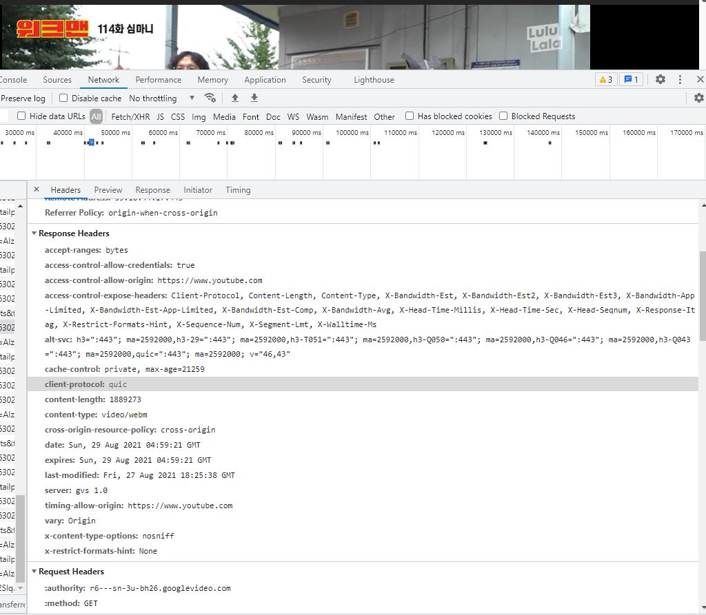 이 의문들을 당장 해결하기 위해서, 바로 유튜브를 켜고, 개발자 도구를 열어서, 당장 Response Header를 살펴보았다.